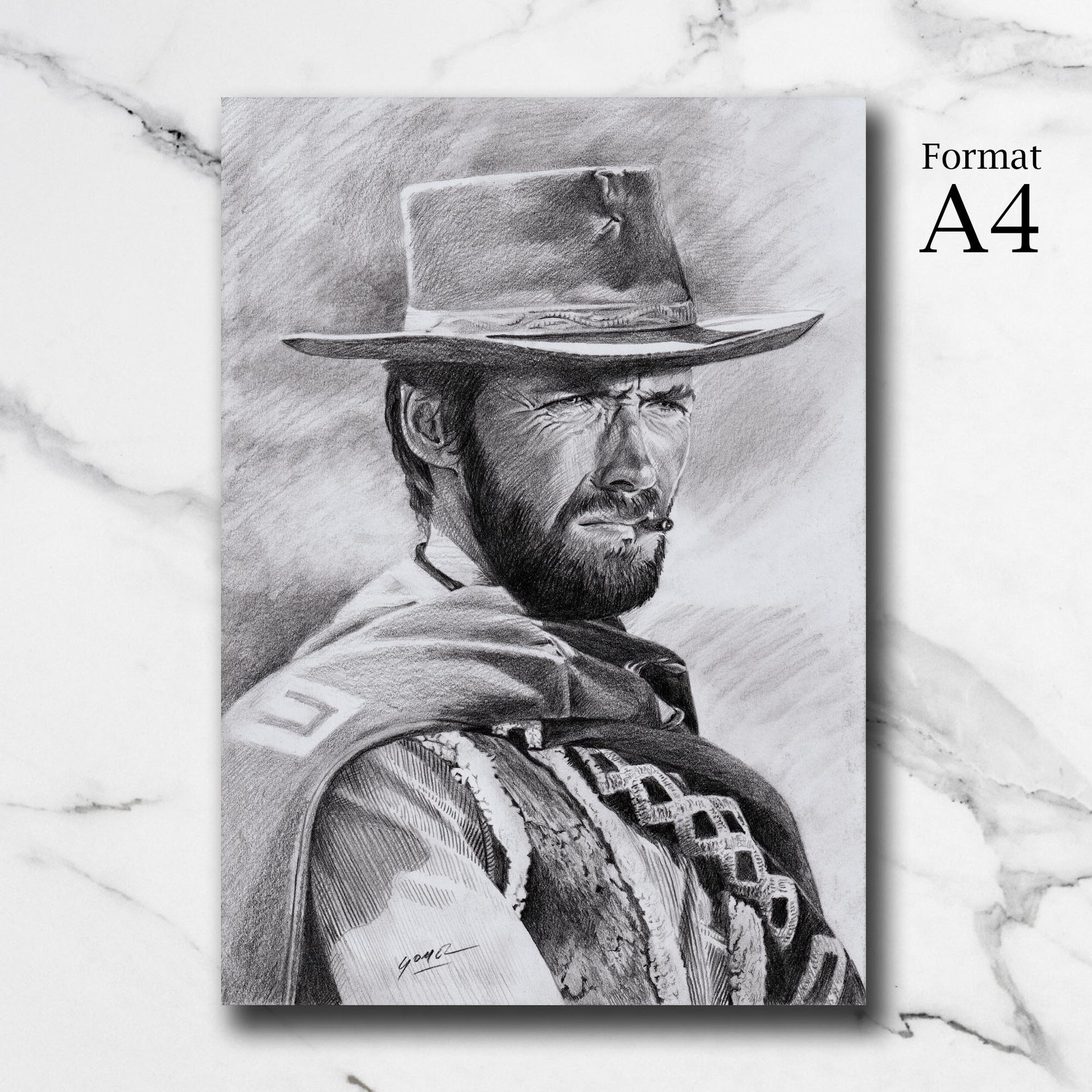 Plongez dans l’univers mythique du western spaghetti avec ce portrait original de Clint Eastwood, inspiré du chef-d’œuvre de Sergio Leone : Le Bon, la Brute et le Truand (1966). Réalisé à la main au crayon graphite sur papier A4 (21 × 29,7 cm), ce dessin saisit toute l’aura de Blondin — son regard perçant, son poncho légendaire et la poussière du désert.