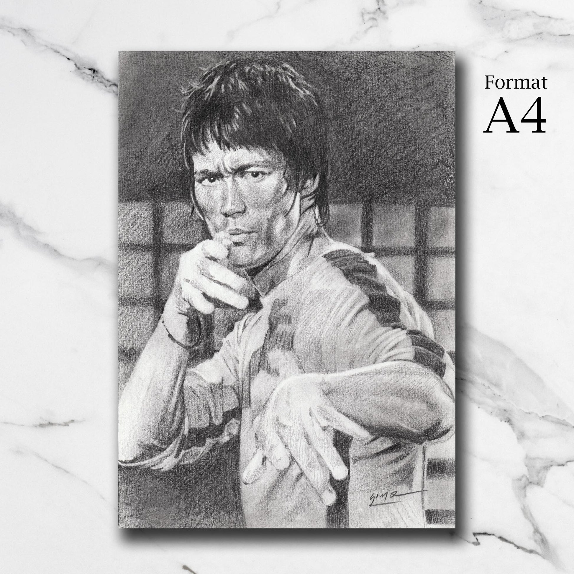 🟡 Bruce Lee dans "Le Jeu de la mort", reconnaissable à sa mythique combinaison, immortalisé dans sa fameuse pose devenue culte. Chaque trait de crayon capture la tension, la détermination… et l’icône des arts martiaux.