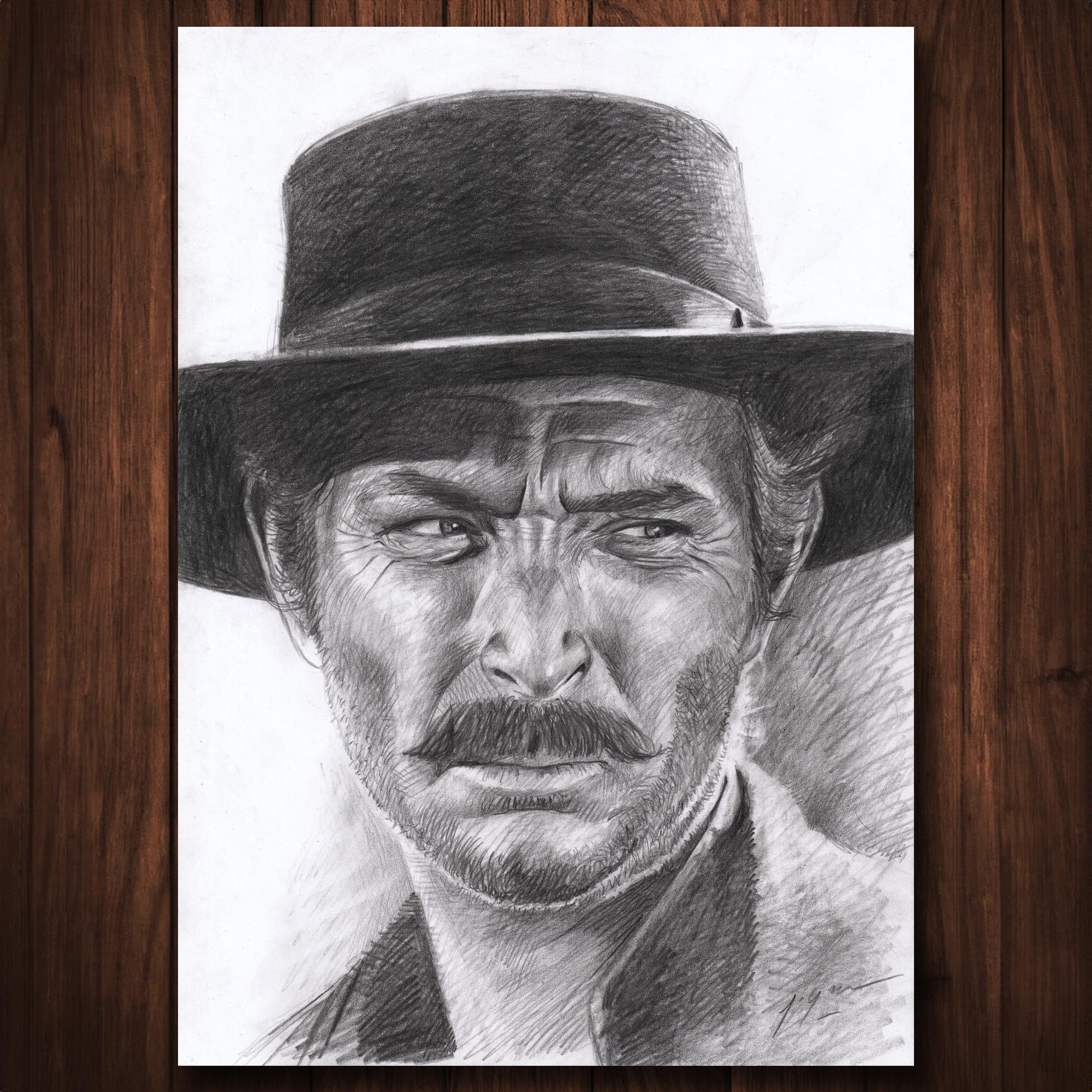 Ce portrait A4, réalisé au crayon sur papier lisse style bristol, capture l’aura froide, patiente et implacable de Lee Van Cleef alias Sentenza dans Le Bon, la Brute et le Truand.